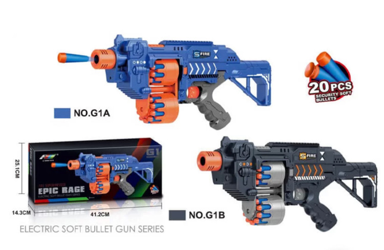 این تفنگ اسباب بازی پر طرفدار 20 عدد تیر اسفنجی همراه با خود دارد که می توان به وسیله آن خشاب های مسلسل را پر کرد و تیرها را پشت سر هم پرتاب کرد. قدرت پرتاب مسلسل G1 بسیار خوب بوده و به نحوی طراحی شده است که تیر های پرتابی آن ضرب زیادی نداشته و خطرناک نباشد. البته که رعایت احتیاط در استفاده از همه تفنگ های تیر پرتابی لازم و ضروری است.